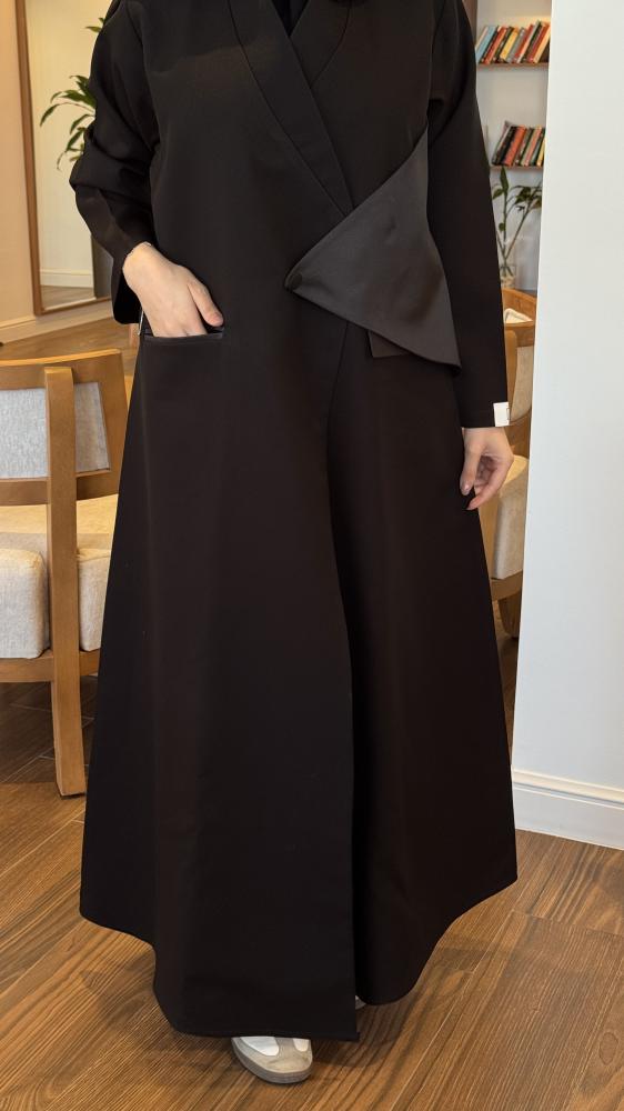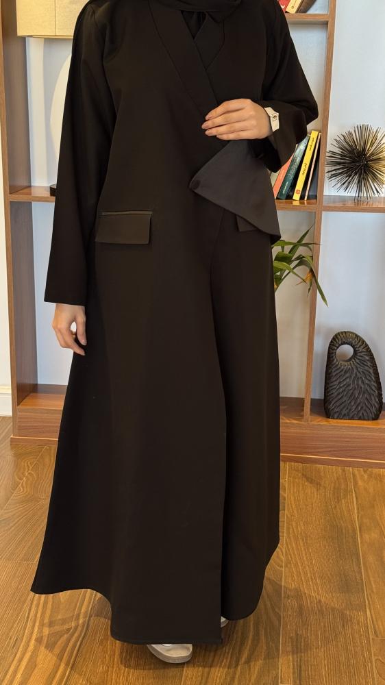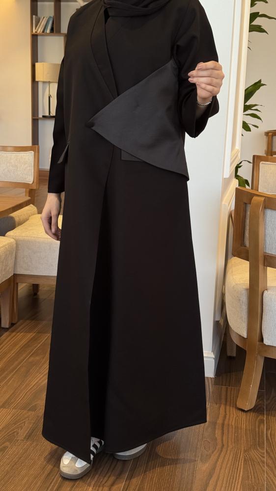 عباية سوداء بتصميم بليزر راقٍ يجمع بين البساطة والفخامة. تتميز بتقفيلة جانبية باللون الرمادي على الجهة اليسرى، تضيف لمسة عصرية أنيقة دون مبالغة. القصة نظيفة وانسيابية، تعكس شخصية واثقة وذوق عالي في الاختيار.